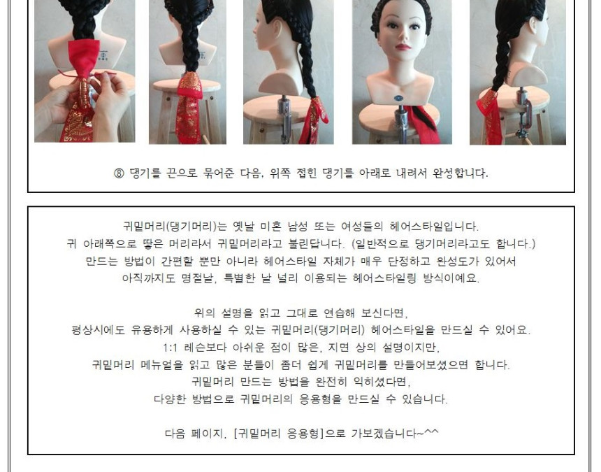 귀밑머리(댕기머리)를 좀 더 다양한 방법으로 응용하여 땋을 수 있는 방법에 대해 설명하고 있습니다.