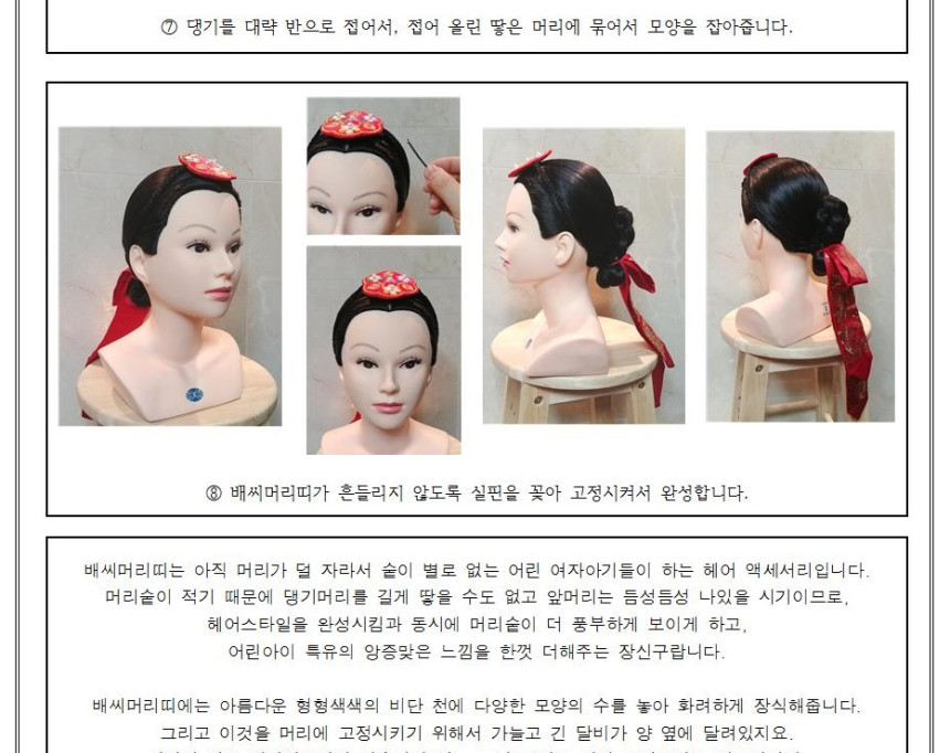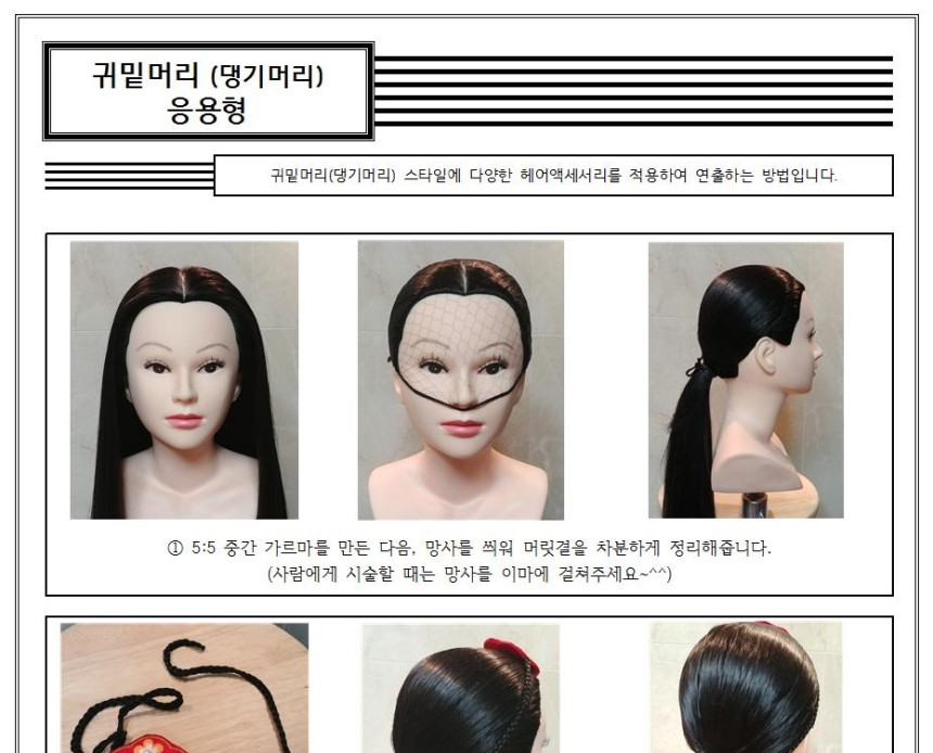 일반적인 귀밑머리 모습과 함께, 짧은 머리에도 사용할 수 있는 댕기매는 방법을 설명하였습니다.